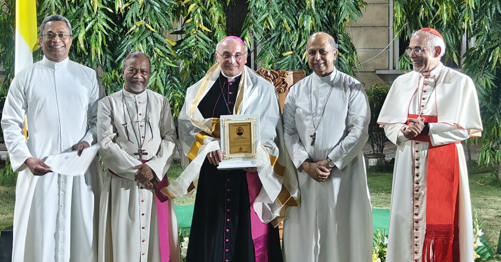 As a gesture of appreciation, Cardinal Filipe Neri Ferrão presented a memento to Archbishop Girelli. Archbishop Peter Machado and Archbishop Anil Couto honoured him with a traditional Indian shawl. Rev. Dr. Stephen Alathara handed over a letter of gratitude on behalf of the Latin Church in India.