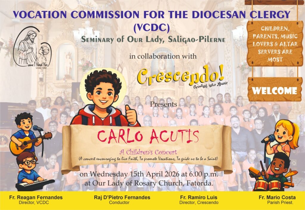 The Vocation Commission for the Diocesan Clergy (VCDC) of the Seminary of Our Lady, Saligao-Pilerne will present a special children’s Choir Concert titled “Carlo Acutis” on Wednesday, 15th April 2026 at 6.00 p.m. at the Our Lady of Rosary Church, Fatorda.