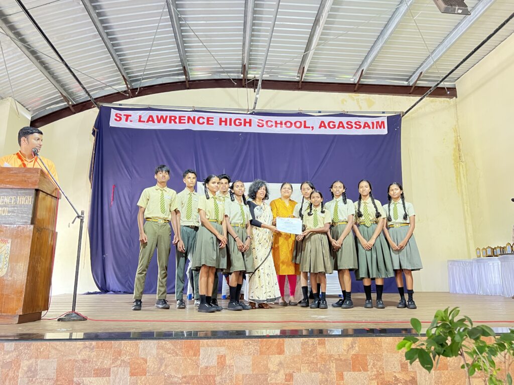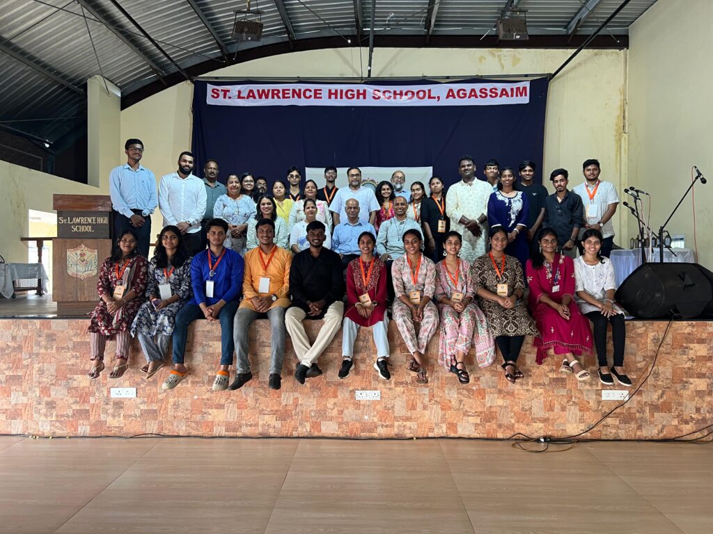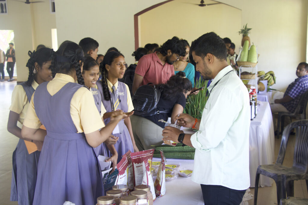 The day began with an interactive session with Dr. Shreyas Jadhav, who engaged over a hundred high school students from six schools on the challenges faced by farmers. He encouraged them to seek innovative solutions, explore careers in agricultural sciences, and remain rooted in their communities by supporting the farmers around them. Later, these students participated in an experiential nature walk facilitated by Ms. Tallula D’Silva, Ms. Ahana, and their team, exploring the landscape of Agassaim. They collected seeds, weeds, and leaves to create mandala art and shared their learnings through group presentations, reflecting on the significance of farming and ecological balance.